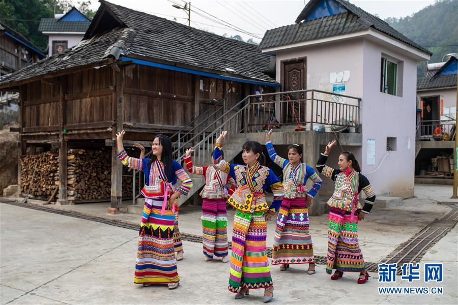 4月10日,在云南省勐海县布朗山乡曼囡村曼班三队,娜四(中)和村民一起跳舞。