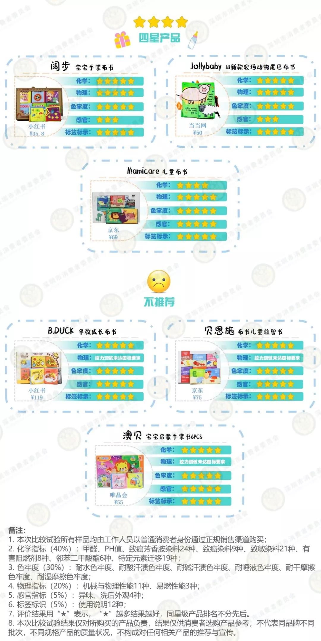 本次比较试验从化学指标、色牢度、物理指标、感官指标及标签标识这5项指标测试评价婴幼儿布书的优劣。其中,5星产品9款,全部达到本次比较试验设定的检测指标;4星产品3款,一项指标未达到本次比较试验设定的检测指标;不推荐产品3款,机械与物理性能测试不符合国家强制性标准要求。详情如下: