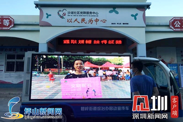 连日来,碧岭街道将移动宣传车开上街头,主要宣传点设在人员较为密集的社区文化广场、街心公园、商超区域,该车两侧安装有彩色户外LED显示屏和音箱,借助移动多媒体开展主题宣传,循环播放文明城市创建公益广告。