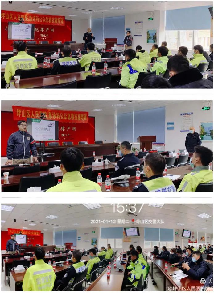 1月12日,坪山区人民医院急诊科主任王瑞和护士陈娟再次来到坪山交警大队开展心肺复苏培训。