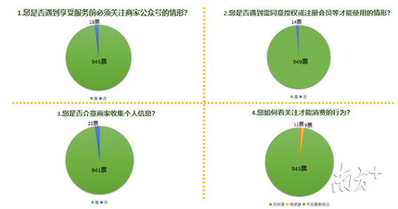 同时,深圳市消委会以线上投票的方式调研了消费者对扫码消费问题的看法,共963名消费者参与了投票。其中945名消费者遇到享受服务前必须关注公众号的情形,949名消费者遇到需同意授权或注册会员才能使用的情形,941名消费者表示介意商家收集个人信息,943名消费者认为商家不应该强制要求关注公众号。