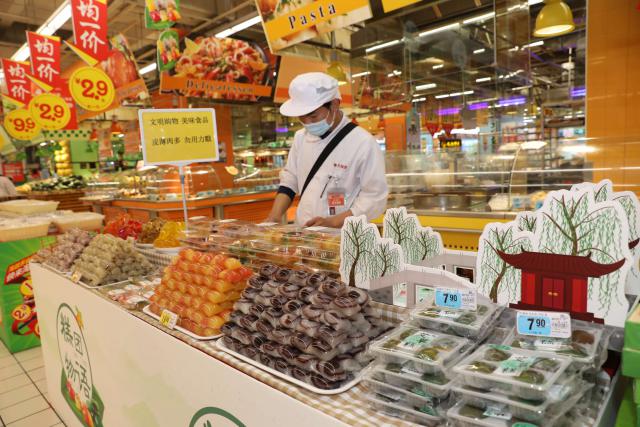 ▲商家将青团产品整齐摆放。