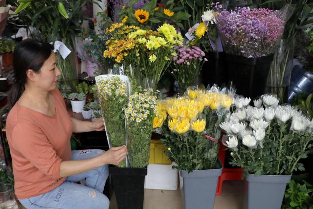▲临近清明,花店店主将白菊花、白百合、雏菊等较为适用于祭祀扫墓的花摆放在店门口供市民挑选。