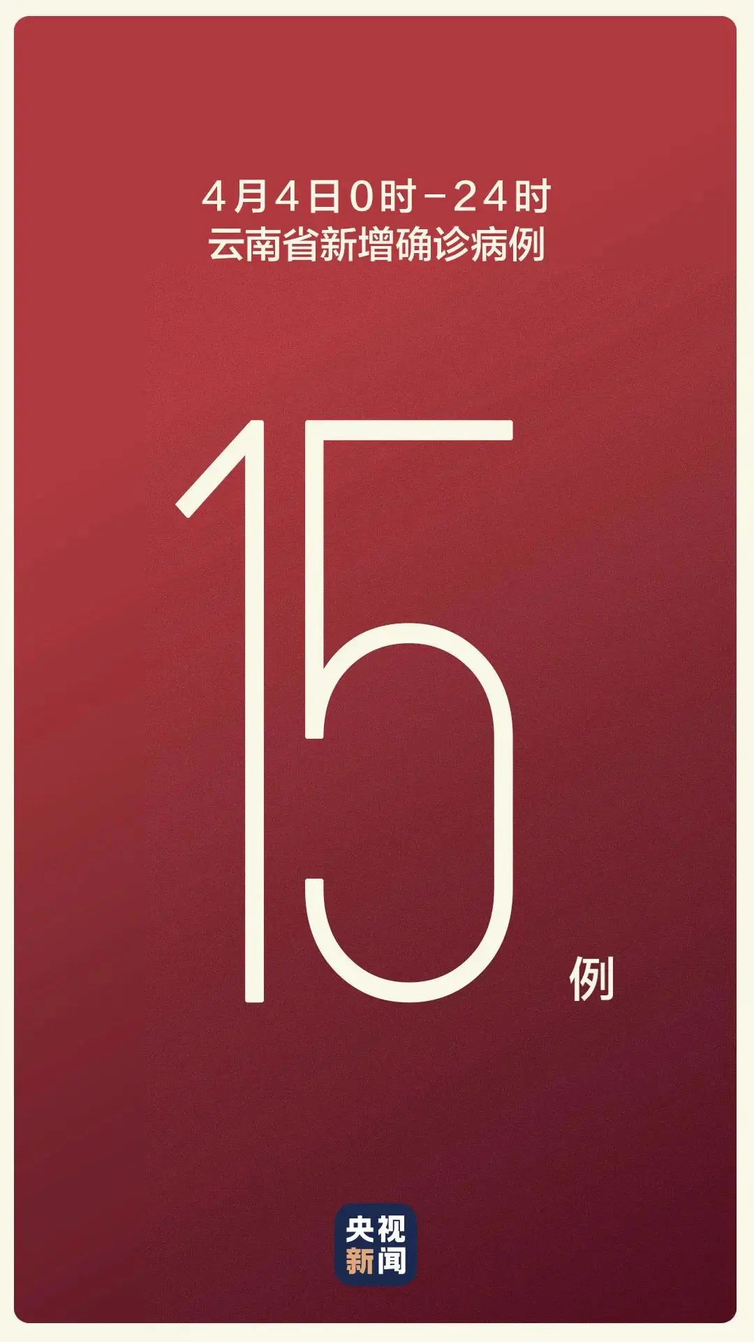 据云南省卫健委消息,4月4日0时至24时,云南新增确诊病例15例,新增无症状感染者5例。