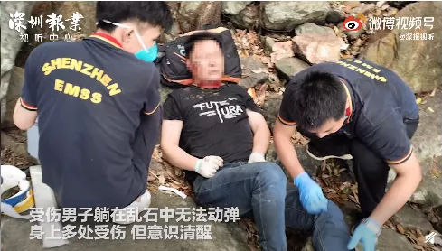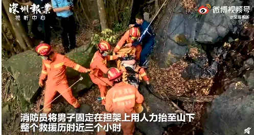 了解情况后,消防员在医生的协助下将受伤男子固定在担架上,先用绳索将男子安全降至崖下,随后使用人力一路将受伤男子抬至山下,并移交给罗湖中医院,整个救援历时近三个小时。