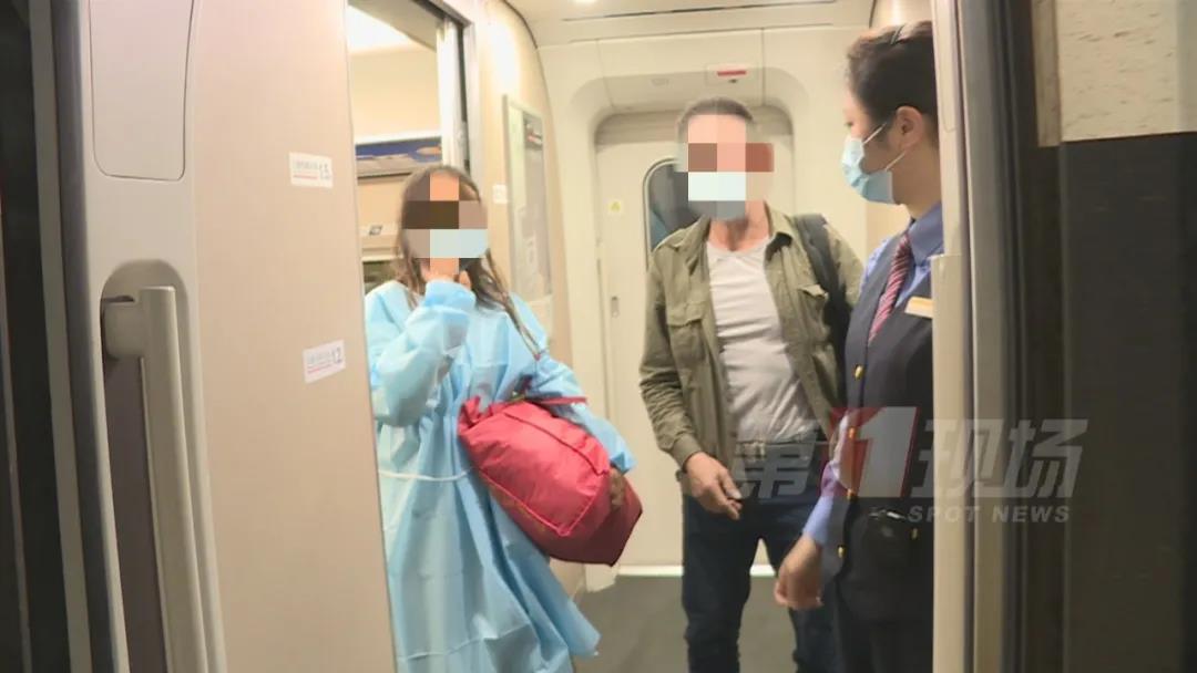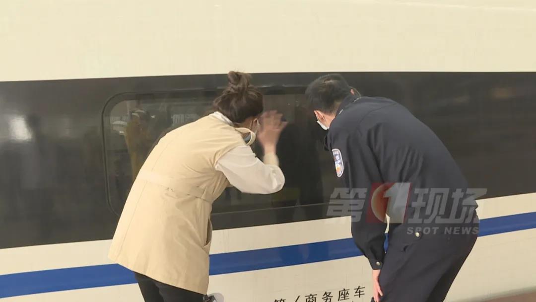 ▲父女两人登上高铁,民警记者送行