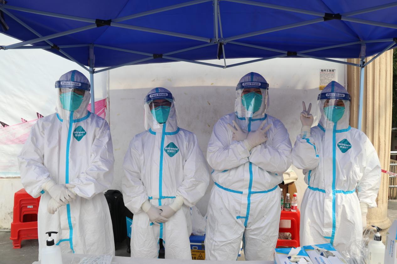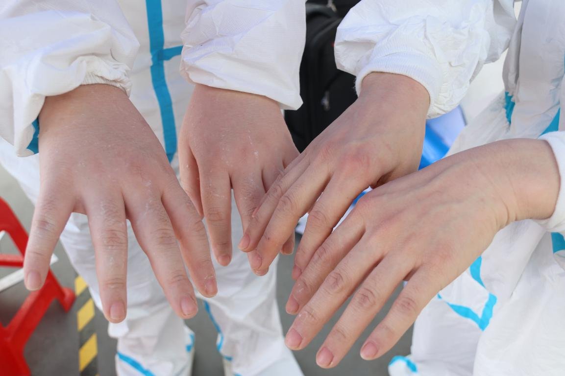 医护人员挺身而出,克服困难,冲在最前沿,奋战在核酸检测岗位。室外33摄氏度的高温,他们双手被手套捂得发白,防护服内的衣物全部湿透,不少采样结束后的居民对医护人员由衷地道一声:“你们辛苦了”。