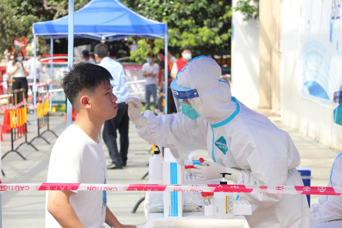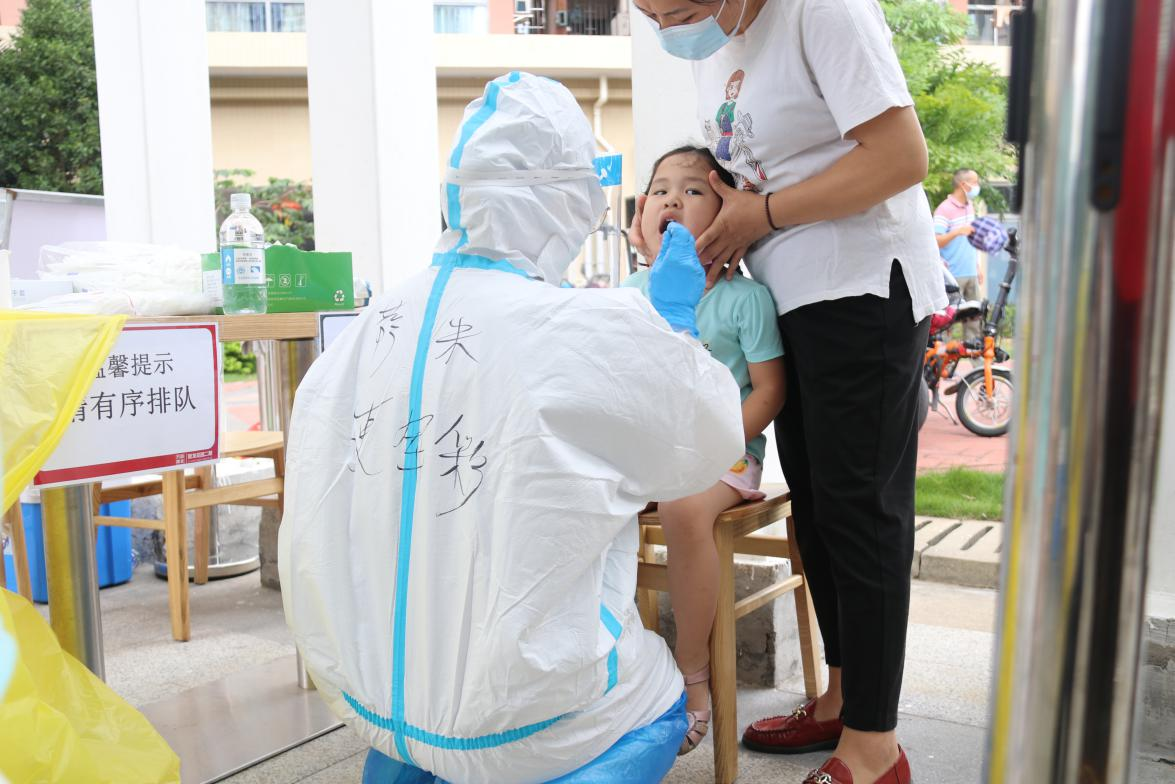 在工作人员的指引下,前来检测的居民群众主动自觉配合,经过志愿者核查个人信息、身份证等一系列程序,有序排队进行检测。面对小朋友检测时出现的不适反应,除了送上精心准备的糖果之外,医护人员和志愿者都不忘称赞:“小朋友很坚强,真棒”。