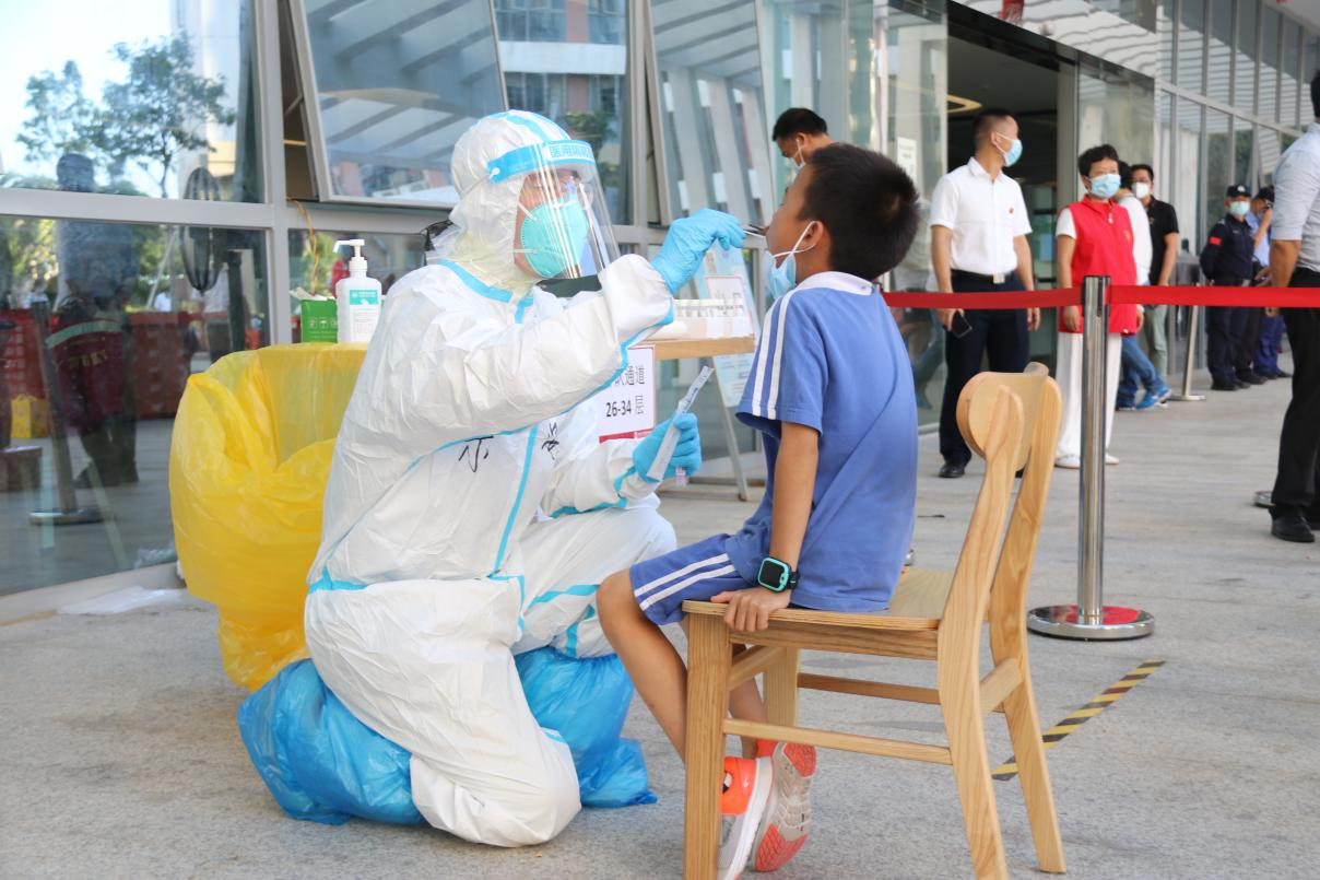 读特客户端·深圳新闻网2021年6月5日讯(记者 杨涛)“小朋友,不要怕,张开嘴一会就好了,啊——”在聚龙花园核酸检测点,一位医护人员单膝跪在地上,压低身子,用棉签轻轻地触碰小男孩的咽喉壁。透过医用隔离面罩,只能看得到这位医护人员戴着一副眼镜,神情认真专注。