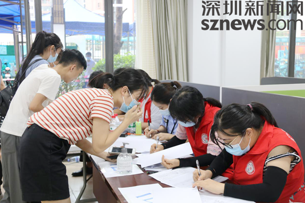 竹坑社区澜湾花园采样点,网格员、社区工作者、义工等全员上阵,开展现场引导、信息登记工作,各楼栋信息按顺序分门别类,居民过来就能快速登记上。“请问你是住在哪一栋楼,A栋在那边,B栋在这里”,遇到使用手机不熟练的年长者,工作人员立即上前询问并提供帮助。