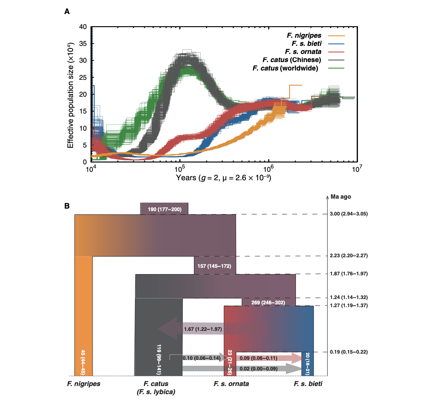 研究人员发现,中国本土的野猫尽管没有参与中国家猫的驯化起源,但是荒漠猫与同域家猫之间,存在近期的、广泛的基因渗透。