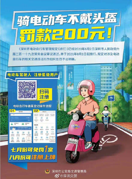 读特客户端•深圳新闻网2021年7月5日讯 8月1日起,骑行电动车未佩戴安全头盔的将根据《深圳市电动自行车管理规定(试行)》处罚200元。头部是人体最脆弱,也是最容易受到致命伤害的部位。电动车骑行者一旦发生事故,头部与坚硬的路面或电线杆碰撞,无异于以卵击石。这种险,冒不得!在享受电动车为我们提供的便捷同时,我们也要做到正确骑行,严守交规。深圳交警提醒:骑车上路,务必牢记,正确佩戴安全头盔。