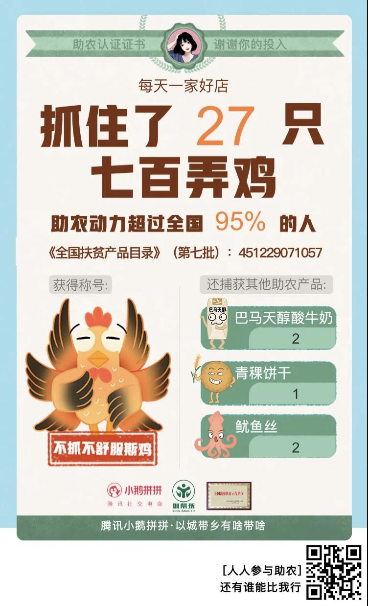 游戏很简单,就是在20秒有限时间内,看看你能抓住多少奔跑中的“七百弄鸡”和其他助农产品。游戏结束后,会有一个认证证书,可以看到自己的助农动力值。