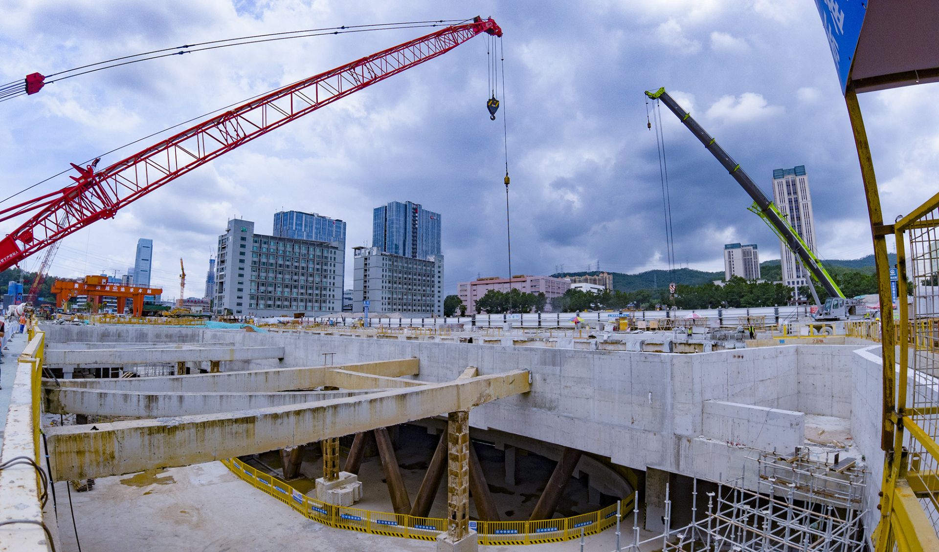施工过程中,在深铁集团、中国中铁联合体项目部的科学组织下,施工单位中铁隧道局集团克服了征地拆迁体量大、施工环境复杂、工期紧等诸多难题。通过BIM技术模拟、优化施工方案,以“开工即是大干、大干就是决战”的劲头,配足配强各项施工要素,采取分段、分多作业面同时施工,保证了工程进度。同时发挥项目部党员先锋作用,成立党员攻坚克难小组,人人身上有任务,个个肩上有担子,加大与地方拆迁办、街道办对接沟通工作,凝聚各方力量协同作战,有效推动征地拆迁工作进展,为车站主体结构施工创造条件、提供有力支持。