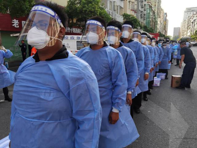 当日深圳最高气温34℃,医护人员穿着防护服在高温下工作