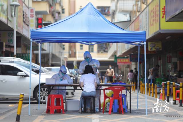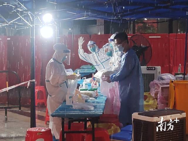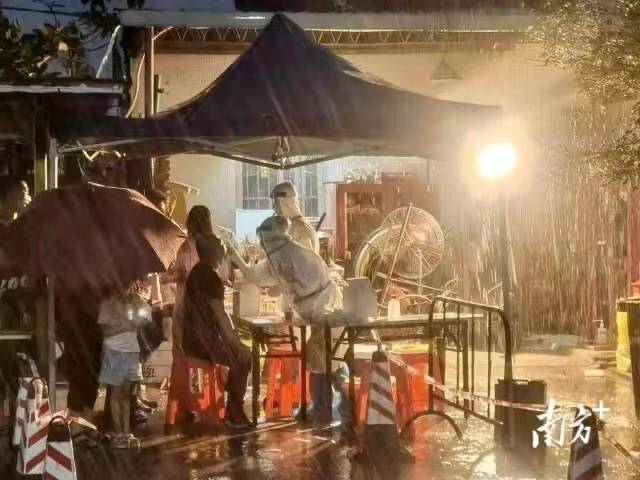 6月22日7时,深圳发布红色暴雨预警,全市托儿所、幼儿园和中小学停课。但在各社区核酸采样点,核酸采样工作依然在有序开展。核酸采样队员冒雨出发,帐篷翻了社区马上修复,工作人员撑“移动帐篷”送居民回家等场景屡屡出现。
