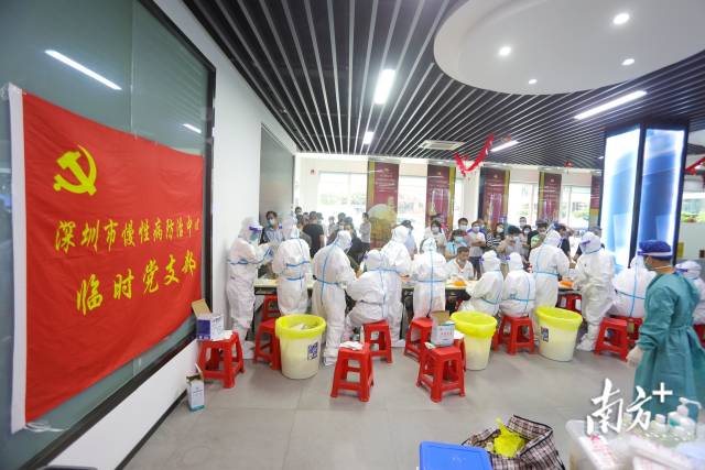 龙岗区园山街道安良社区核酸检测点,深圳市慢性病防治中心临时党支部核酸采样队正在工作