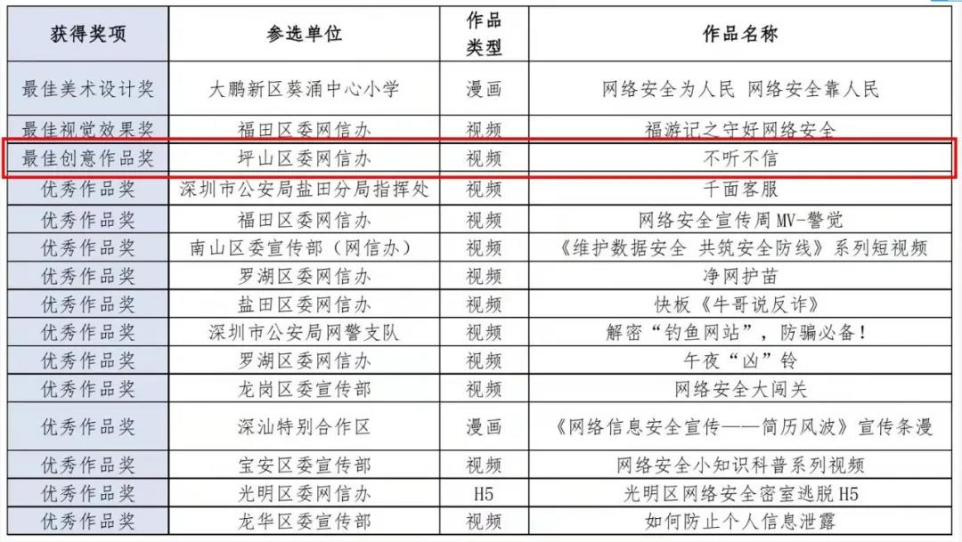 除了中小学生主题征集活动,坪山区党政机关也纷纷参与宣传作品创作,区委网信办、区工业和信息化局、区政务服务数据管理局、坪山公安分局和区文联等单位共提交了8个作品,其中,区委网信办的视频作品《不听不信》在2021年深圳市网络安全群众性宣传作品征集活动中荣获机关组“最佳创意作品奖”。