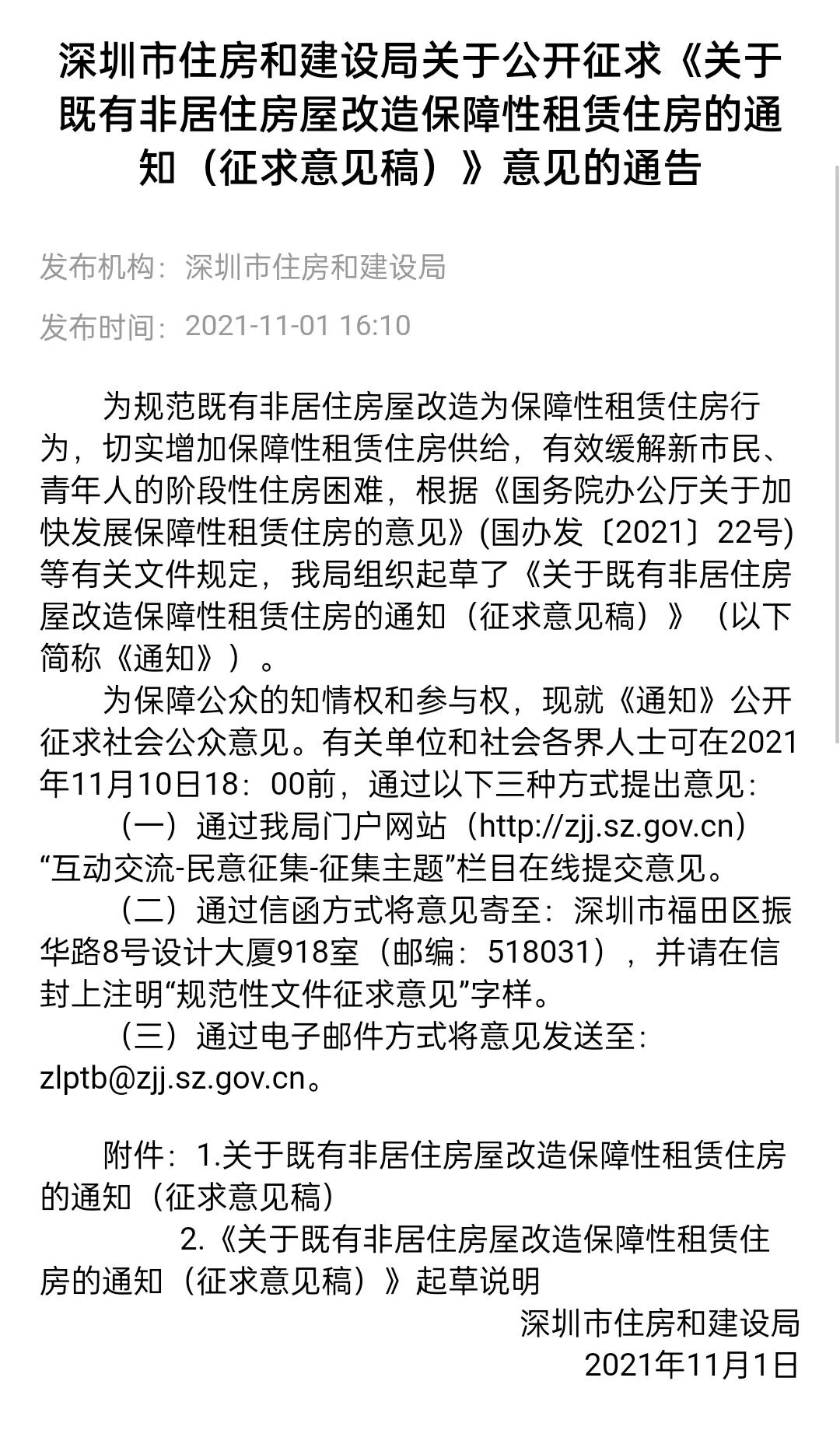 为规范既有非居住房屋改造为保障性租赁住房(以下简称“非居改保”)行为,切实增加保障性租赁住房供给,深圳市住房建设局组织起草了《关于既有非居住房屋改造保障性租赁住房的通知(征求意见稿)》(以下简称《通知》),《通知》于11月1日起向公众公开征求意见。