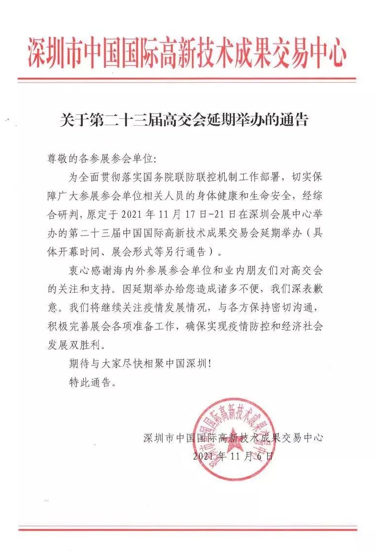 据“高交会”官方微信公众平台消息:为全面贯彻落实国务院联防联控机制工作部署,切实保障广大参展参会单位相关人员的身体健康和生命安全,原定于2021年11月17日-21日在深圳会展中心举办的第二十三届中国国际高新技术成果交易会延期举办,具体开幕时间、展会形式等将会另行通知。