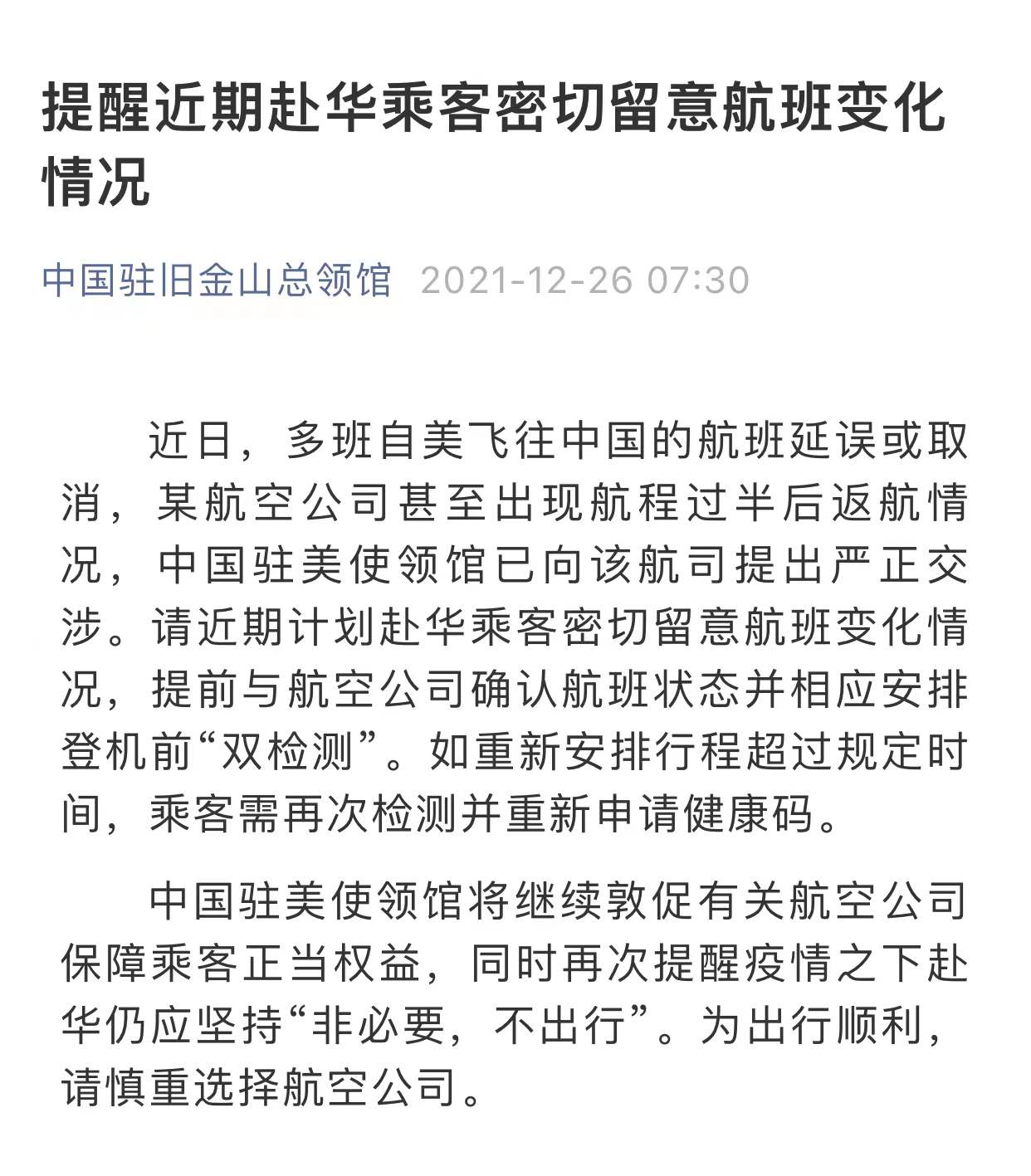 据中国驻旧金山总领馆26日消息:近日,多班自美飞往中国的航班延误或取消,某航空公司甚至出现航程过半后返航情况,中国驻美使领馆已向该航司提出严正交涉。请近期计划赴华乘客密切留意航班变化情况,提前与航空公司确认航班状态并相应安排登机前“双检测”。如重新安排行程超过规定时间,乘客需再次检测并重新申请健康码。