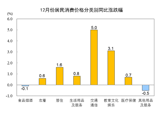 12月份,食品烟酒类价格同比下降0.1%,影响CPI(居民消费价格指数)下降约0.03个百分点。食品中,畜肉类价格下降22.2%,影响CPI下降约0.94个百分点,其中猪肉价格下降36.7%,影响CPI下降约0.81个百分点;蛋类价格上涨12.7%,影响CPI上涨约0.08个百分点;鲜菜价格上涨10.6%,影响CPI上涨约0.23个百分点;水产品价格上涨7.9%,影响CPI上涨约0.14个百分点;鲜果价格上涨4.8%,影响CPI上涨约0.09个百分点;粮食价格上涨2.0%,影响CPI上涨约0.04个百分点。