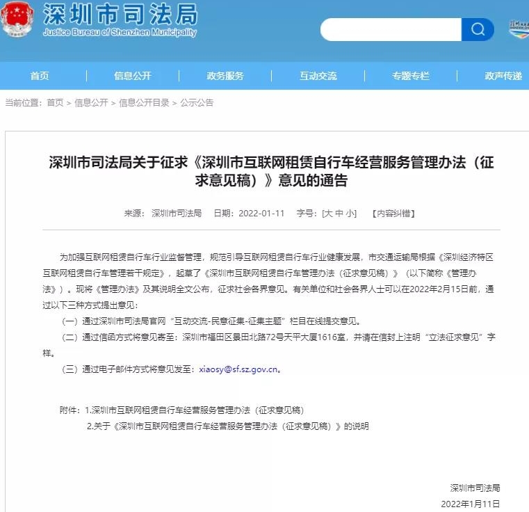 读特客户端·深圳新闻网2022年1月12日讯 (深圳特区报记者 林清容)11日,深圳市司法局在官网发布《深圳市互联网租赁自行车经营服务管理办法(征求意见稿)》(以下简称《管理办法》)征求社会各界意见。据悉,《管理办法》明确了互联网租赁自行车经营者准入与退出,以及经营服务规范的要求,并新增设置了处罚措施。