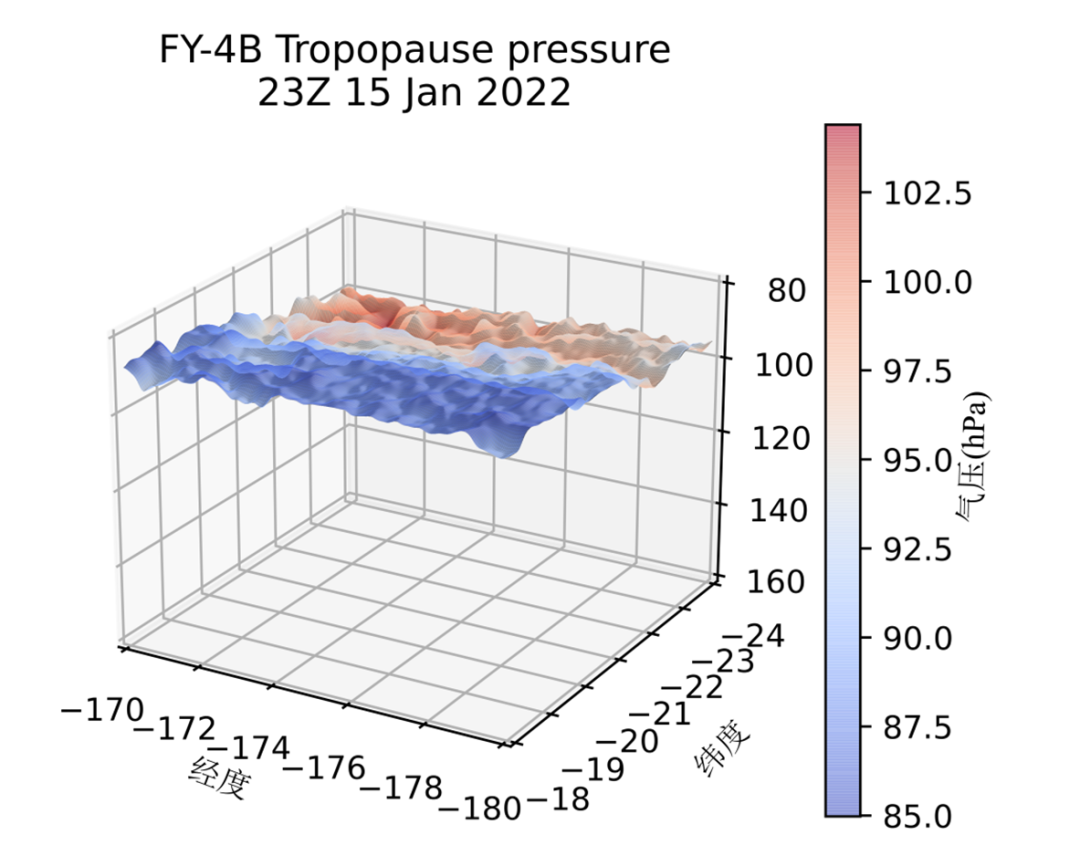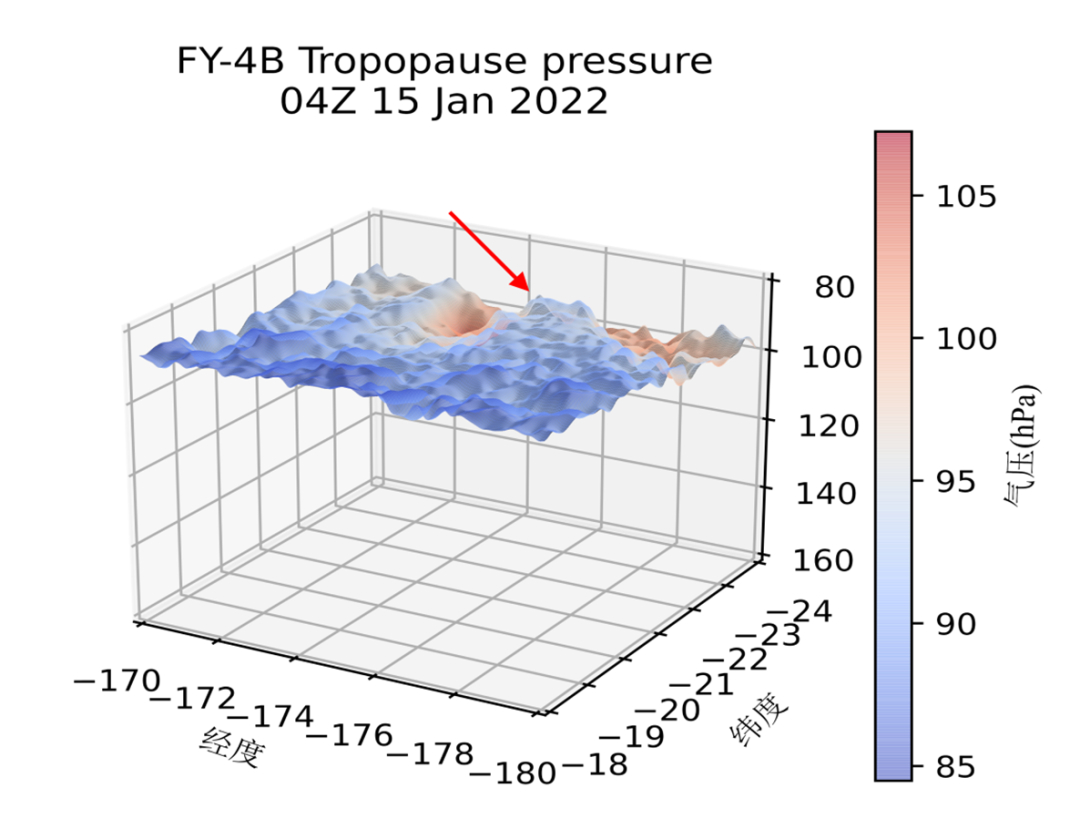 图. FY-4B汤加红阿哈阿帕伊岛火山爆发对流层顶气压三维图(2022年01月15日19:00汤加时)