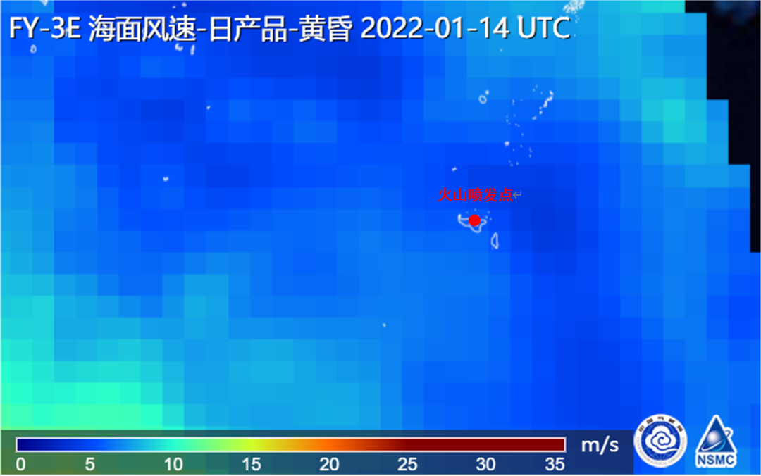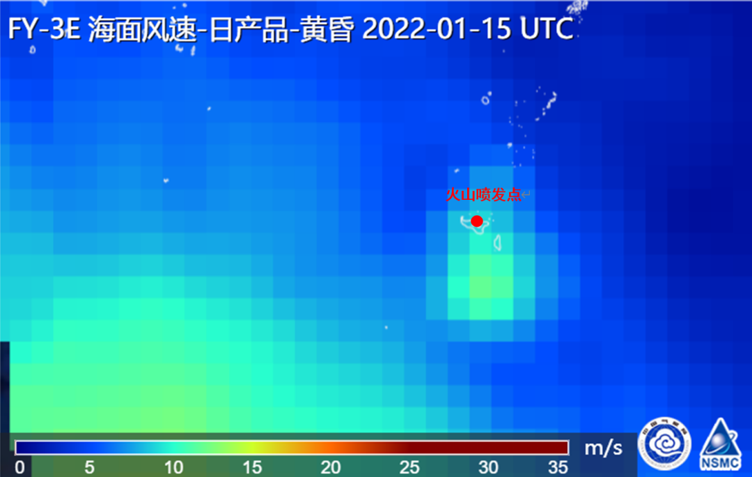 通过1月15日风云三号E星WindRad洋面风产品显示,火山喷发前后汤加附近洋面风速非正常显著增大,表明汤加附近海面出现异常的海浪活动(如下面两幅图所示)。