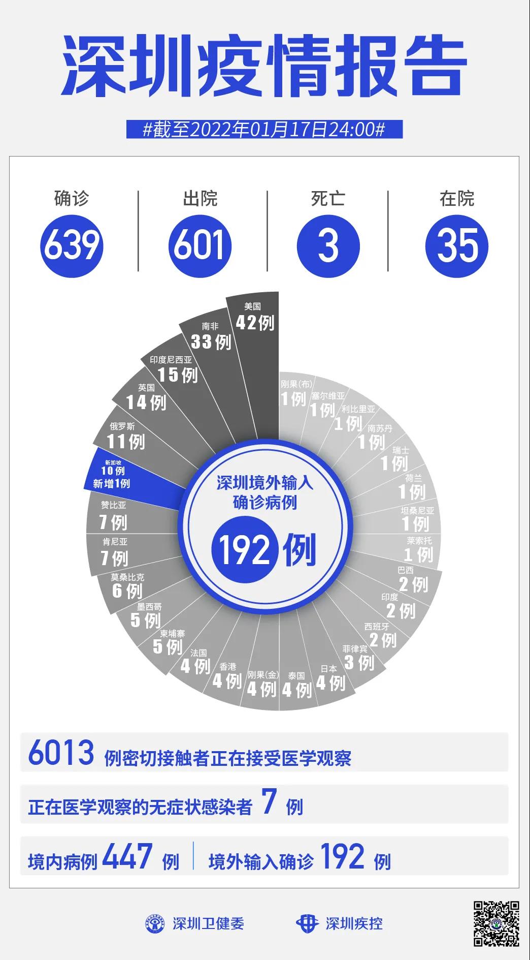 1月17日0-24时,深圳新增境外输入1例确诊病例和1例无症状感染者。