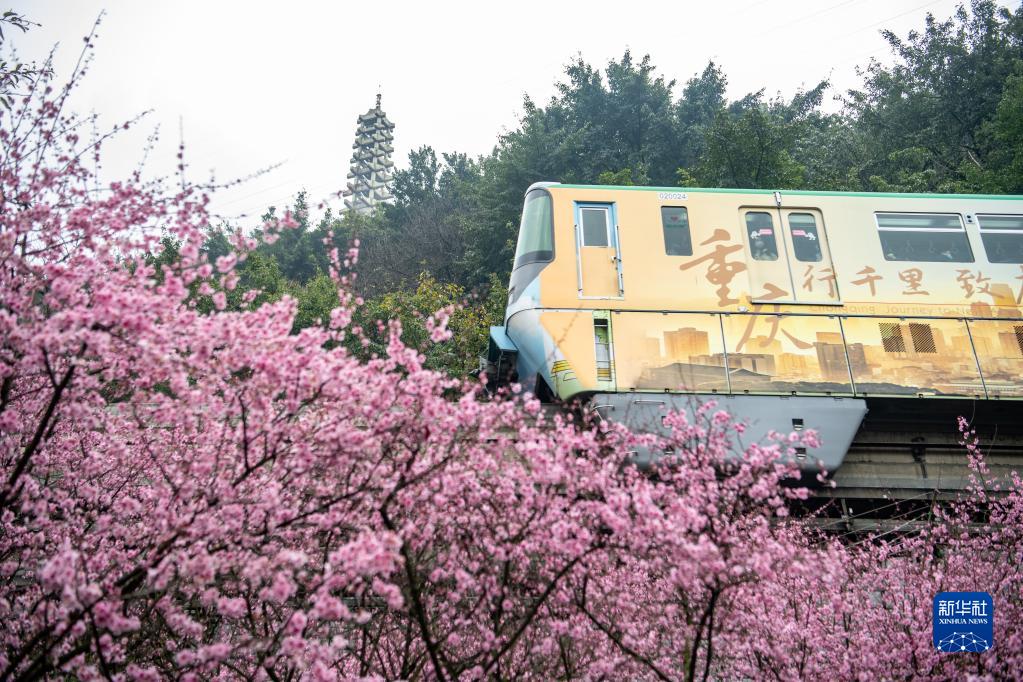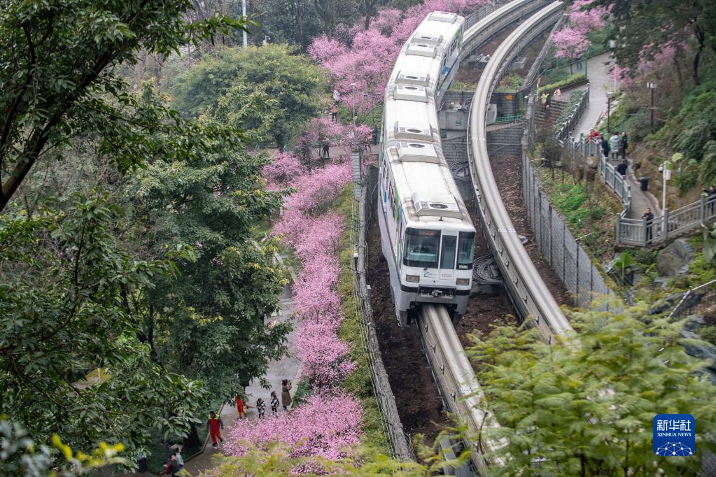 2月20日,重庆轨道二号线列车从花丛中穿过。
