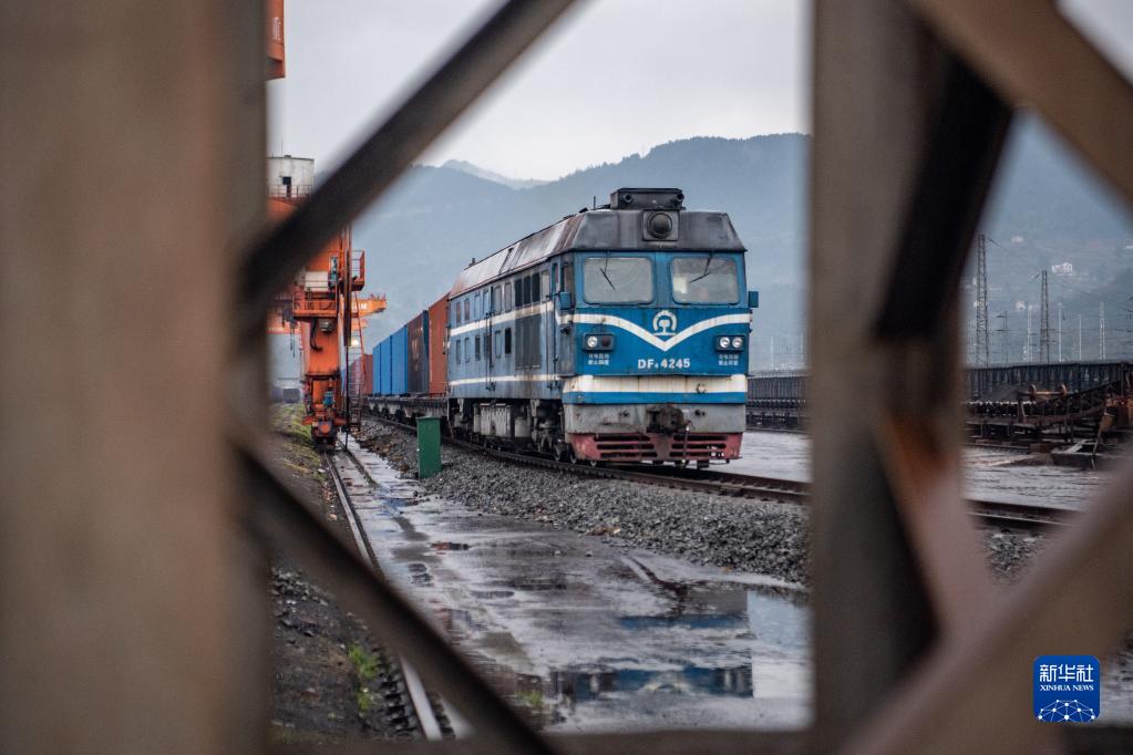 2月19日,作业车辆在重庆果园港牵引中欧班列进行装载作业。