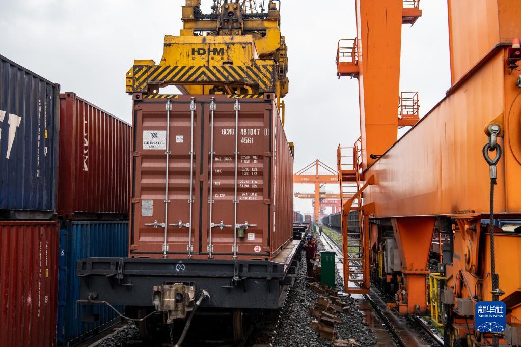2月19日,工作人员在重庆果园港内指挥龙门吊装载集装箱。