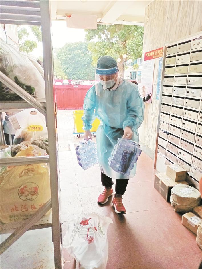 图为本报记者郭秦川在管控区里当义工,为社区居民送餐送菜送快递,一个下午要跑个几十趟。