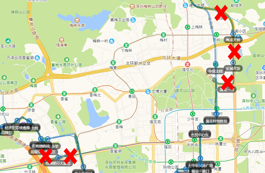 往安托山场站方向增加“中级法院”1个单边公交停靠站,取消“梅龙天桥、长城开发、莲花一村、招商银行大厦③”等4个单边公交停靠站。