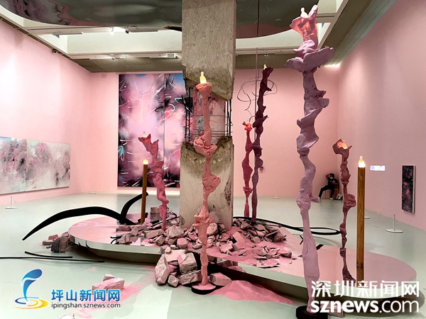 目前,馆内五至六楼正在展出“周力:桃花源•迹”。此次展览是坪山美术馆发起的“深圳当代艺术家系列”的第二篇章,呈现了艺术家周力在2005年至今创作的11件作品。《桃花源•迹》借助东晋陶渊明的《桃花源记》为支点,以“愿景”般的观念书写下个人情感经历在历史进程中的“痕迹”。