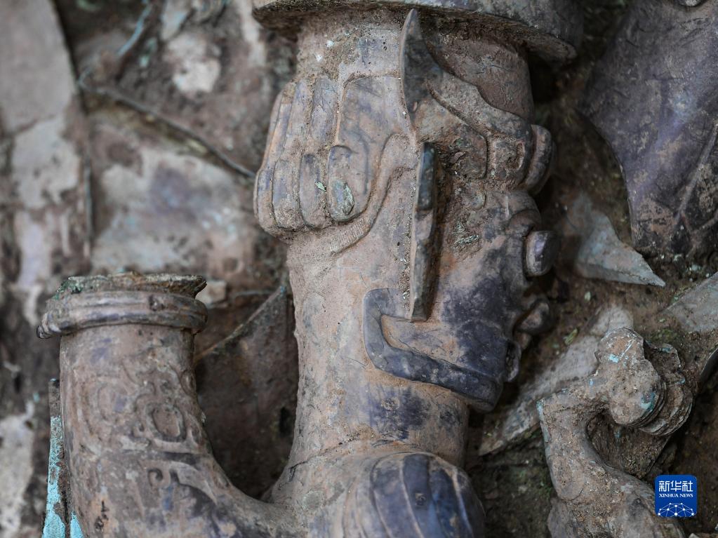 这是在三星堆遗址8号“祭祀坑”拍摄的顶尊蛇身铜人像局部(6月1日摄)。