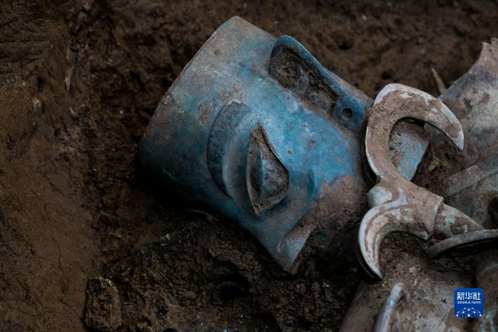 这是在三星堆遗址8号“祭祀坑”拍摄的铜人头像(5月31日摄)。