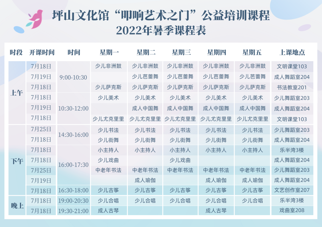 如遇特殊情况,坪山文化馆可能会对培训时间、师资、场地及器材等进行调整。请广大市民朋友务必爱护教室公共财物,如有损坏需照价赔偿。
