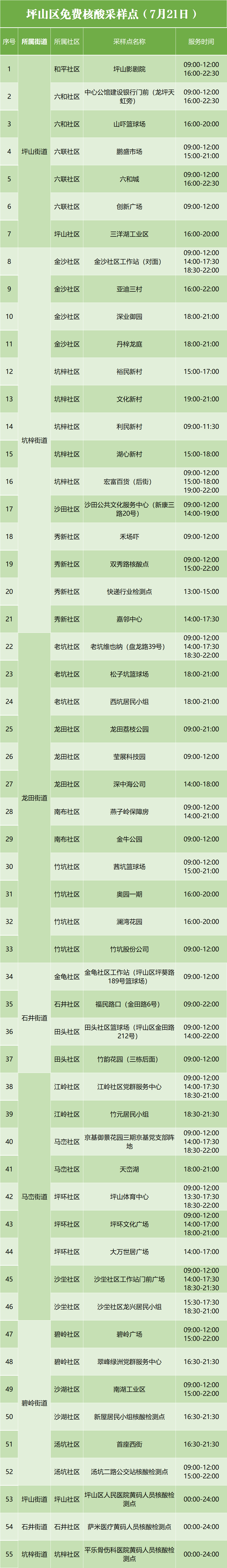 7月21日坪山区免费核酸检测点来啦~