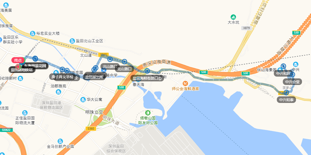 盐田路地铁站、东海丽景花园、庚子首义学校、盐田派出所、北山路口、中兴和泰(东侧,招呼站)、中兴会堂、中兴和园、中兴和泰(西侧)、盐田海鲜街路口①、北山路口、盐田派出所、庚子首义学校、东海丽景花园、盐田路地铁站
