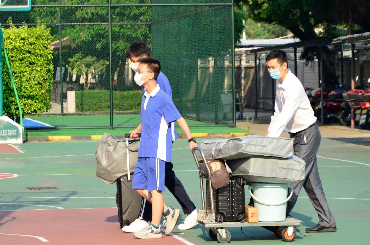 学校老师协助高中住校学生搬运行李。(翻身实验学校(西校区)供图)