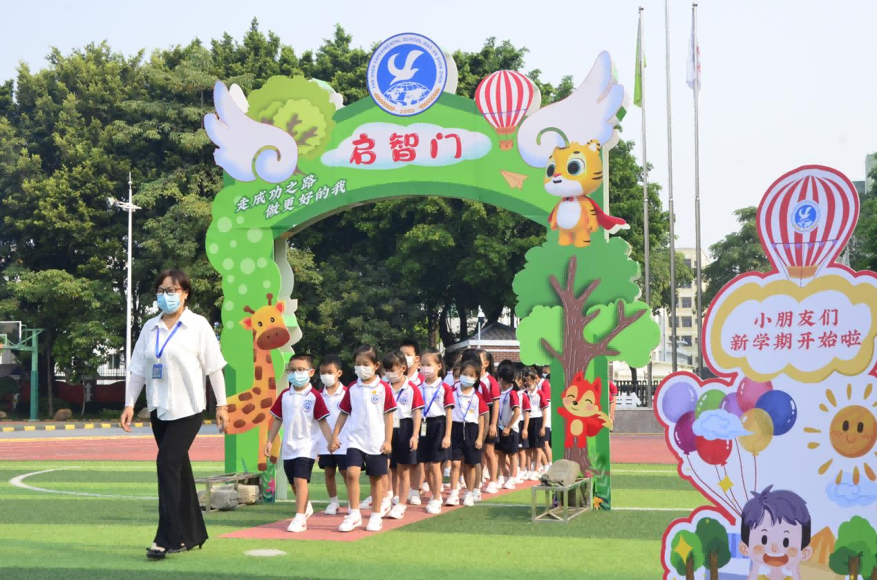 班主任带领一年级学生走过“启智门”。(翻身实验学校(西校区)供图)