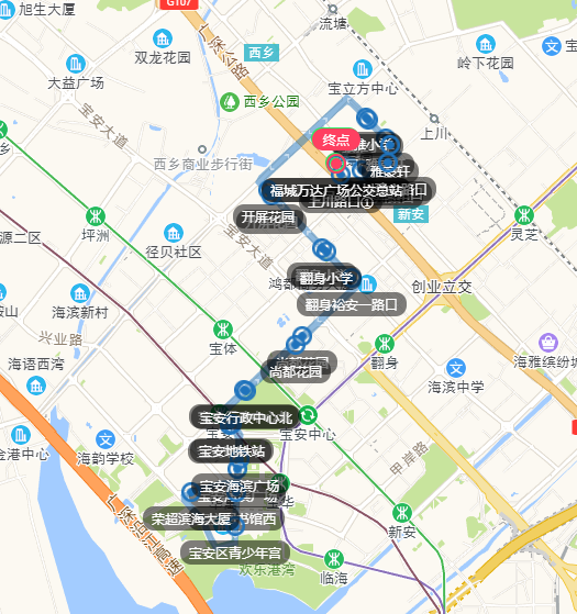 福城万达广场公交总站、宝民一路上川路口、上川建安路口、雅豪轩、弘雅小学、开屏花园、翻身小学、尚都花园、宝安行政中心北、宝安地铁站、宝安海滨广场、宝安图书馆西、宝安区青少年宫、欢乐港湾西、荣超滨海大厦、宝安海滨广场、宝安地铁站、宝安行政中心北、尚都花园、翻身裕安一路口、翻身小学、开屏花园、弘雅小学、雅豪轩、上川建安路口、上川路口①、福城万达广场公交总站