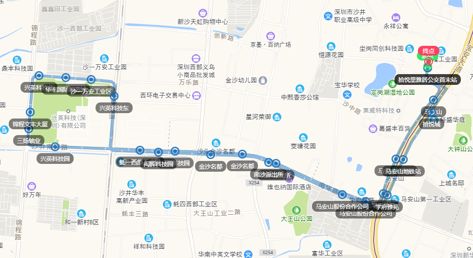 拾悦里雅居公交首末站、马安山、马安山地铁站、学府雅苑、马安山股份合作公司、南沙派出所、金沙名都、闳晖科技园、蚝一西部工业园、兴英科技园、三扬轴业、锦程文丰大厦、兴英科技北、华丰国际智造城、沙一万安工业区、兴英科技东、闳晖科技园、金沙名都、南沙派出所、马安山股份合作公司、学府雅苑、马安山地铁站、拾悦城、拾悦里雅居公交首末站