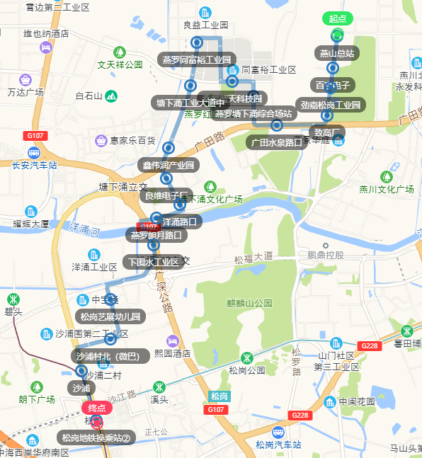 燕山总站、百亨电子、劲嘉松岗工业园、致高厂、广田水泉路口、燕罗塘下涌综合场站、幸福蓝天科技园、燕罗同富裕工业园、塘下涌工业大道中、鑫伟润产业园、良维电子厂、洋涌路口、燕罗朗月路口、下围水工业区、松岗艺展幼儿园、沙浦村北(微巴)、沙浦、松岗地铁换乘站②