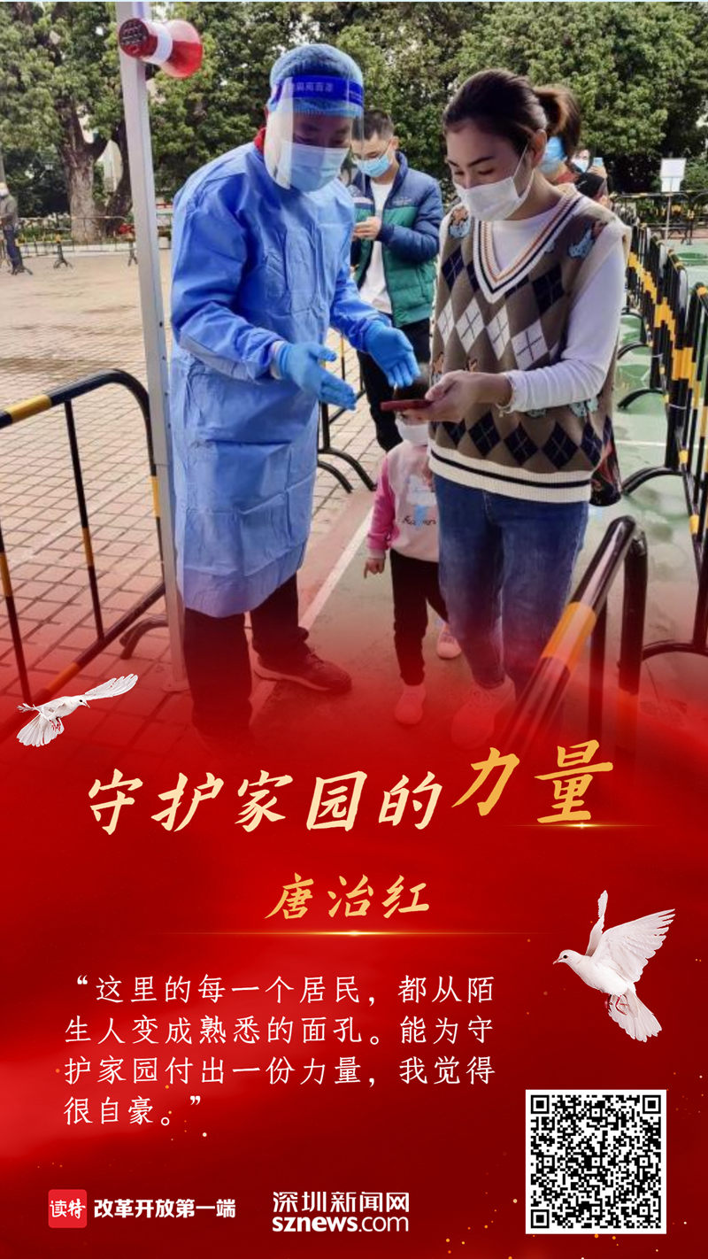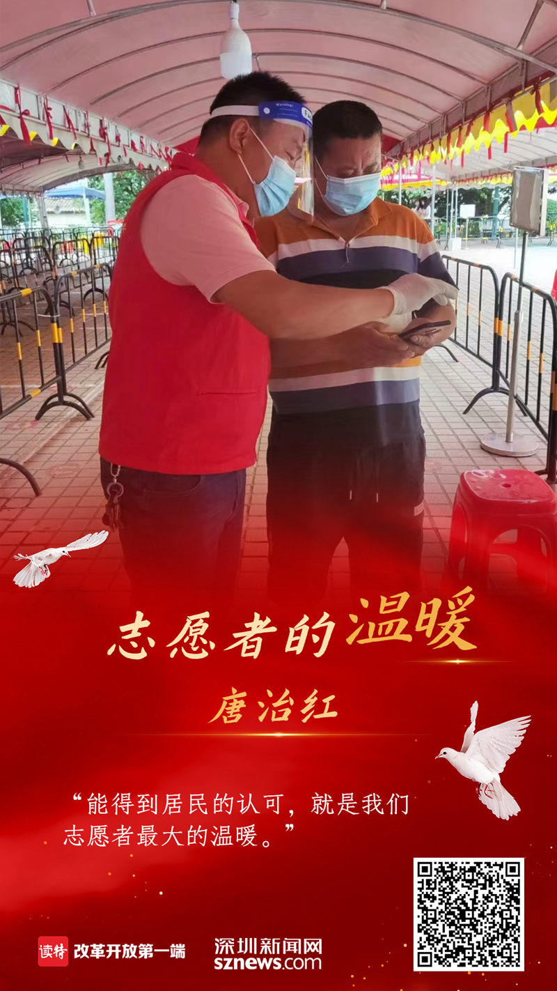 2020年初,新冠肺炎疫情发生,在坪山区团委、街道、社区统一领导下,唐治红迅速组建了一支89人的防疫志愿服务队伍,协助社区开展核酸检测工作。