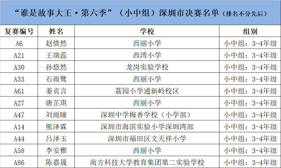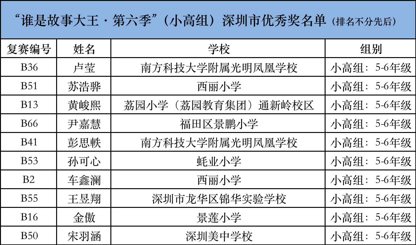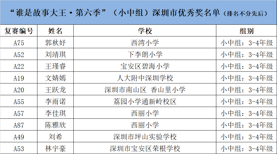 经过评委们的评审,小中组西丽小学赵惜然等11人,小高组碧海小学石沛柔等10人将分别晋级深圳市决赛,现场决出一、二、三等奖,同时小中组西湾小学郭秋妤等10人,小高组南方科技大学附属光明凤凰学校卢莹等10人获得本次大赛的“优秀奖”,“优秀奖”获得者无需在决赛现场讲故事,直接在现场舞台接受颁奖并领取奖品。深圳市决赛暨颁奖典礼的具体举行时间及地点,组委会将根据深圳市疫情防控及线下活动举办要求进行安排,届时,将以电话和短信的方式通知相关参赛、参会人员及学校嘉宾。以下为具体名单: