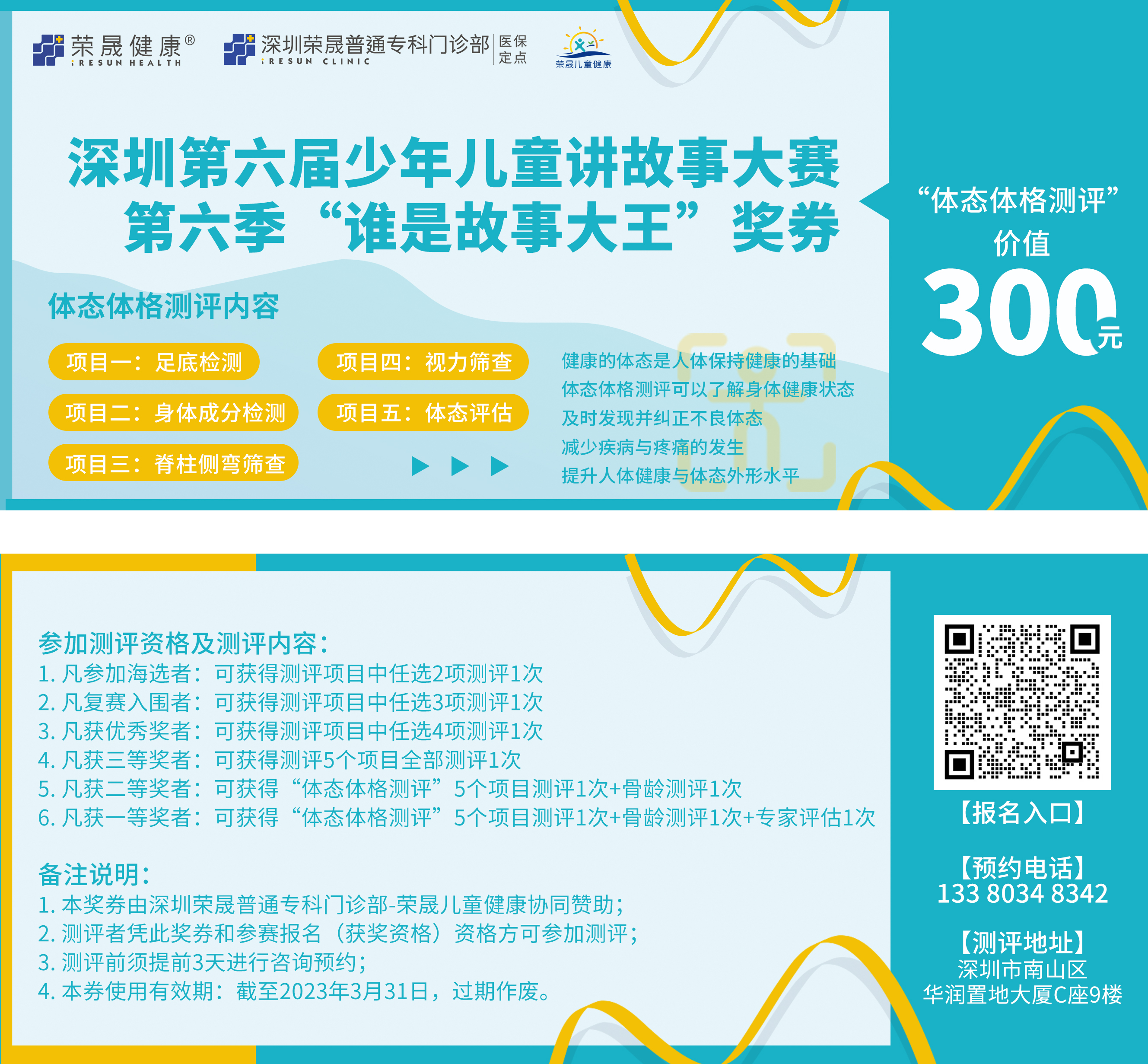 荣晟儿童健康体态体格测评券,“谁是故事大王·第六季”的复赛及以上选手扫码即可预约测评。(荣晟儿童健康供图)