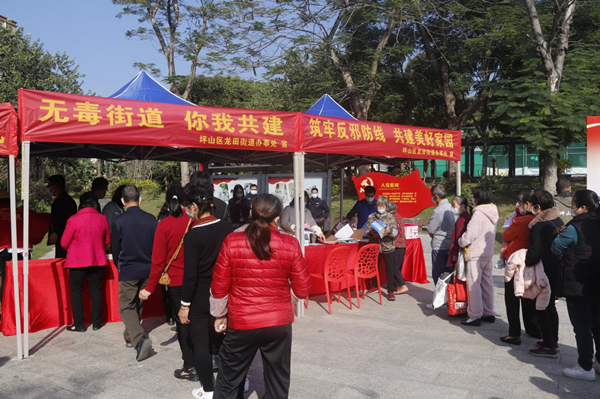 活动中,龙田街道组织人大龙田街道工委、总工会、综合治理办、应急管理办、老坑社区等相关单位及禁毒、反邪、矫正帮教社工共50多名工作人员,在老坑社区盘龙世居广场开展线下大型宣传活动,积极引导参加活动的居民观看宣传视频,现场释法,接受群众法律咨询,共派发宪法、民法典、反有组织犯罪法,以及反恐怖、反邪教、反诈骗、反间谍、反走私反偷渡、禁毒、扫黑除恶、城市信用建设、工会法、安全生产条例等宣传资料15000余份。